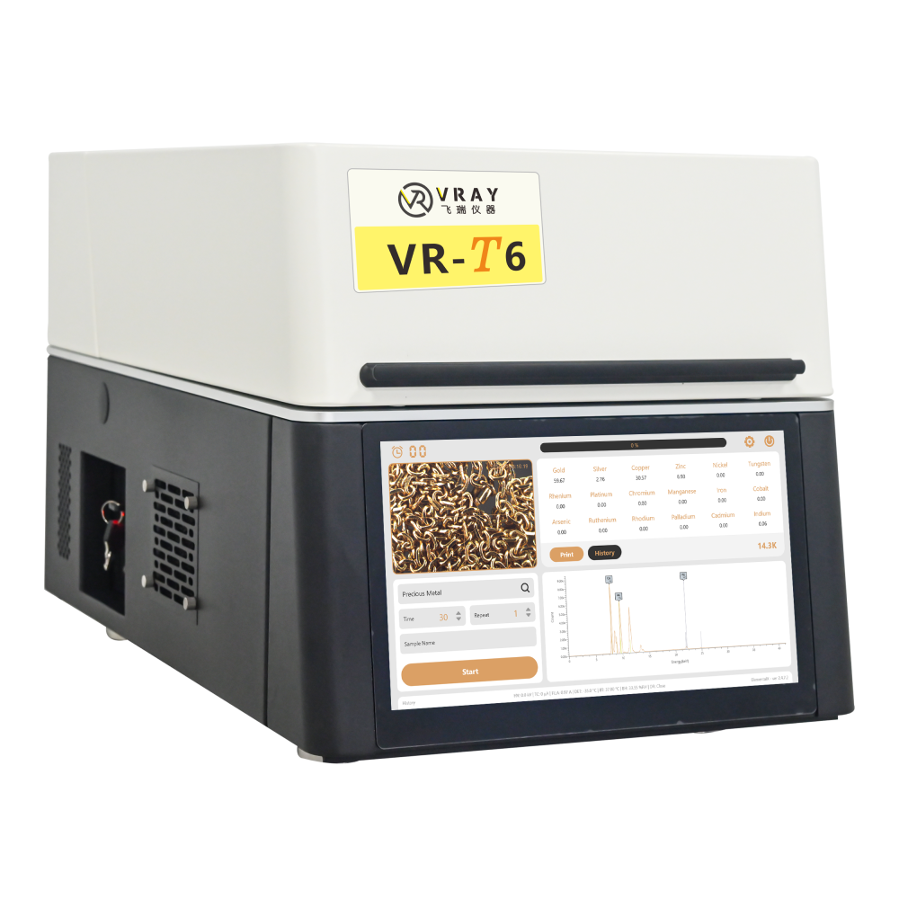 Precious Metal Analyzer VR-T6 XRF Analyzer sets a new standard in the field of precious metals analysis. This cutting-edge, all-in-one model integrates an inbuilt computer and high-resolution screen, providing users with a seamless and efficient experience. It utilizes a down-top analysis design, Multi-FP algorithm software, microlight aggregation technology, and a high-sensitive zoom distance measurement device. VR-T6 is widely used across multiple industries, including jewelry, precious metals, gold recycling and inspection lab.